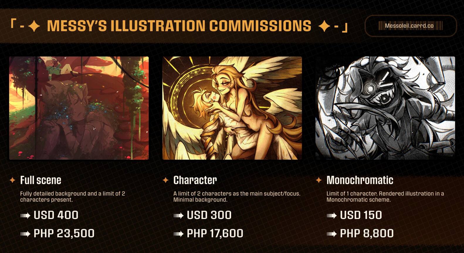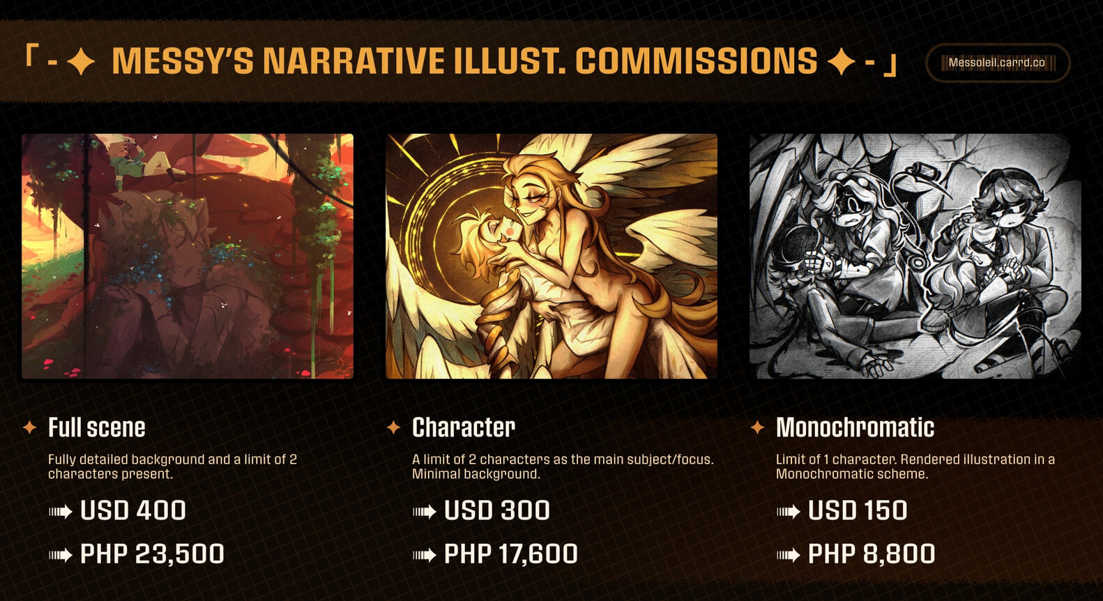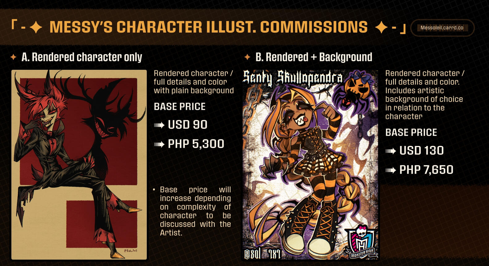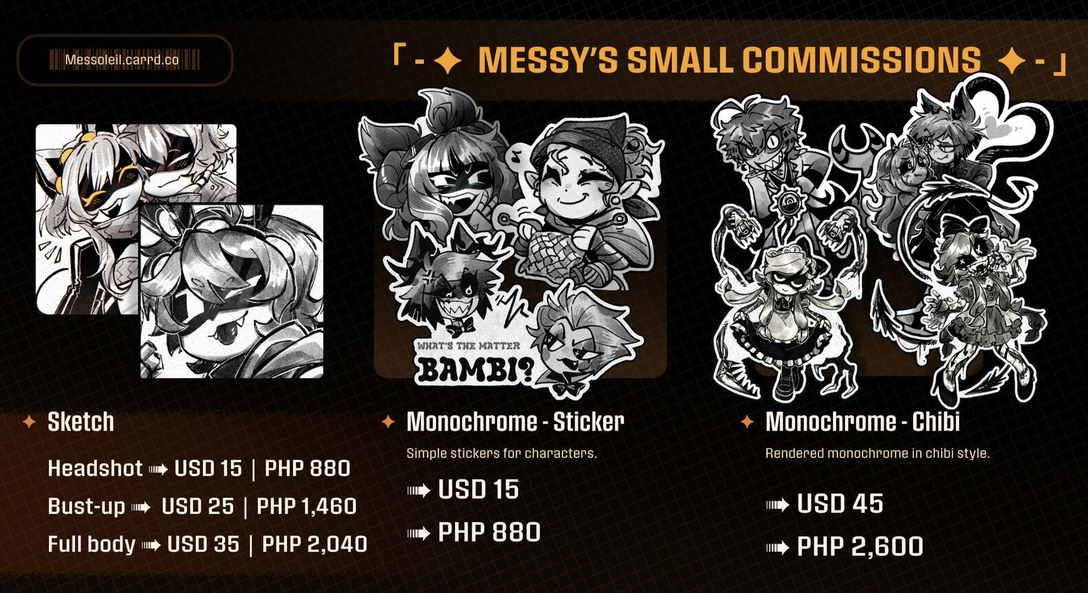 commissions will be drawin in my style! ::]─✦ feel free to contact me through my socials if you have other questions.─✦ if you want your commission to remain private, let me know!─✦ i have the right to decline a commission if my skills do not meet your request or if your request is against my boundaries.─✦ commissions that are fanart-based have the possibility for it to be posted by me or to be used for merch (prints, etc.), excluding those with ocs.─✦ listed on the price sheets are base price only. price may change depending on complexity of commission and additional information.─✦ for larger commissions: starting the commission will lead me to a confirmation process: sketching. once approved, i will proceed to rendering.─✦ files will be sent through email. inclusion: png. w/o watermark, jpg. with watermark for social posting, transparent png / print ready - cmyk (optional)─✦ please note that i tend to be busy (gmt+8) my open hours are usually 2PM-3PM, 8PM and onwards. either way, it depends on my free time in a day.i will update you with a trello link. it can take me a day or week if not busy, but due to my school schedule, and workloads that are not related to acads: it can take months. i can't estimate how long, but I appreciate your patience very much!if there will be further delays or conflicts, i will reach out to you.2025: regarding my past commissions, i will be better, and i will do my best to be more communicative and organized. thank you so much for supporting me, it means a lot to me.see issue here: 🔗️ tumblr response, 🔗️ twitter post - 1, 🔗️ twitter post - 2