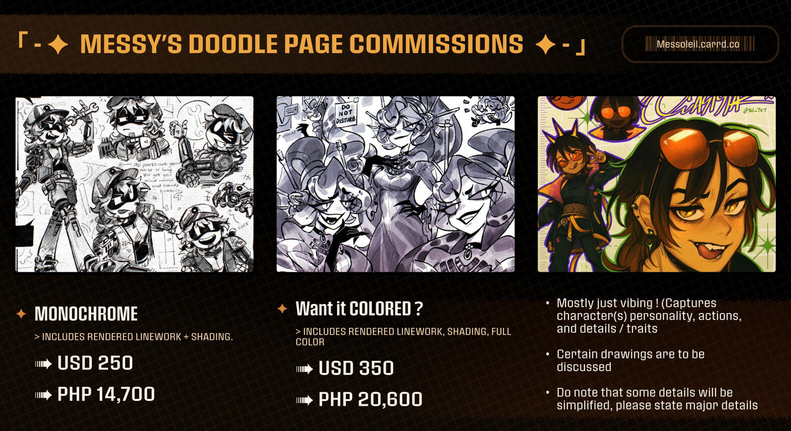 NOTE:╰┈➤ even with those i can draw, but i turn out uncomfortable with the request or that it goes against my terms of service, i will have to decline your commission.╰┈➤ as for sexual themed commissions, please keep it light. maybe in the future i will be more comfortable drawing so. (^ u ^//)╰┈➤ these are my art-based commissions in freelancing. for those interested for multimedia commissions or job offer, please contact me through my socials or my email: [email protected] and i can show you my portfolio and we can discuss about the request further.