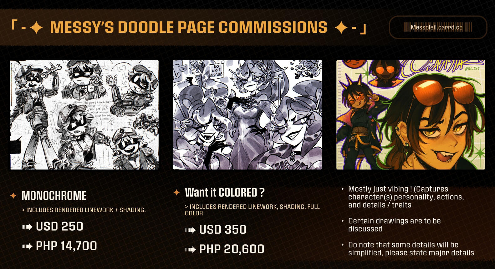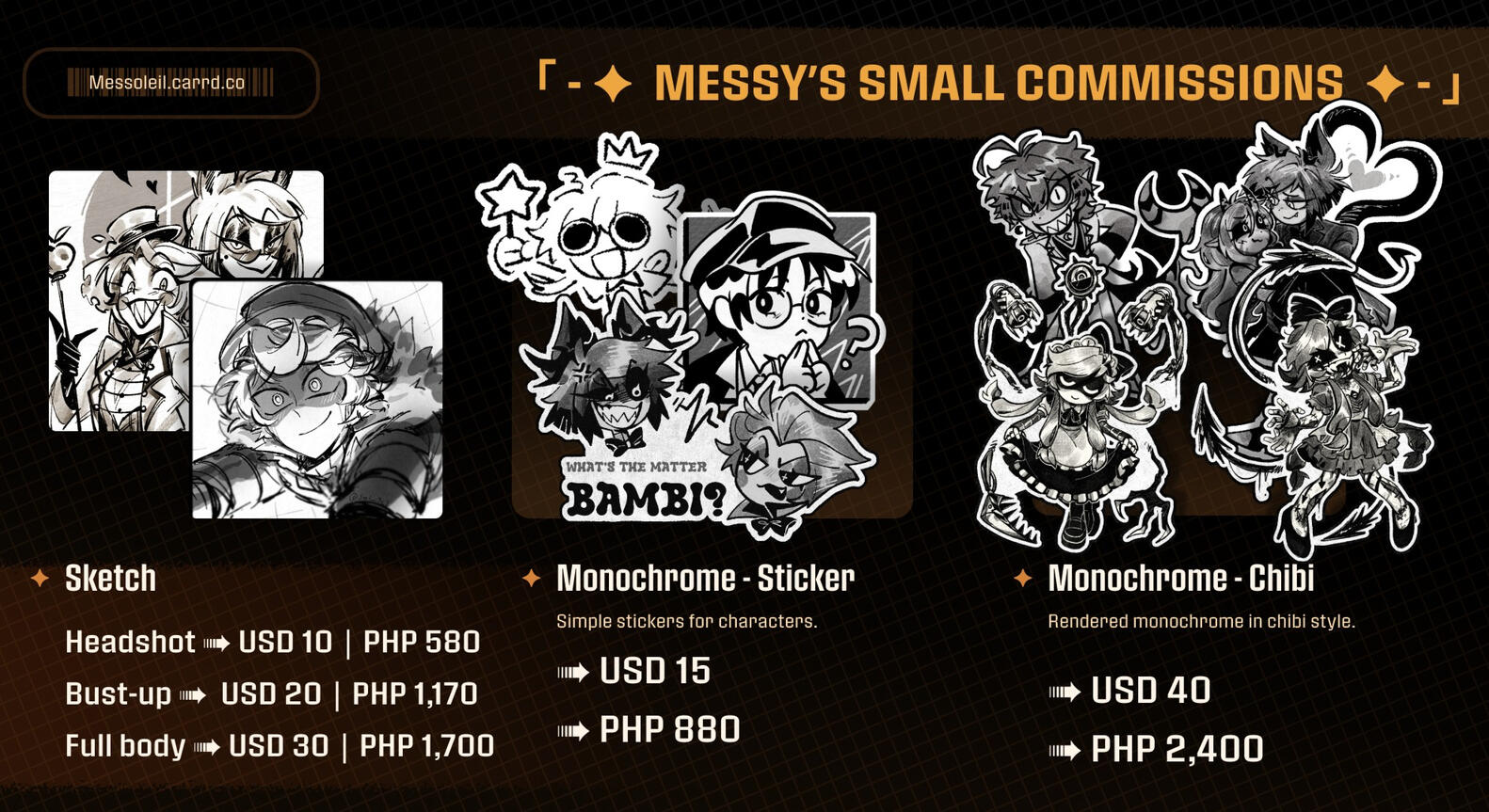 commissions will be drawin in my style! ::]─✦ feel free to contact me through my socials if you have other questions.─✦ if you want your commission to remain private, let me know!─✦ i have the right to decline a commission if my skills do not meet your request or if your request is against my boundaries.─✦ commissions that are fanart-based have the possibility for it to be posted by me or to be used for merch (prints, etc.), excluding those with ocs.─✦ listed on the price sheets are base price only. price may change depending on complexity of commission and additional information.─✦ for larger commissions: starting the commission will lead me to a confirmation process: sketching. once approved, i will proceed to rendering.─✦ files will be sent through email. inclusion: png. w/o watermark, jpg. with watermark for social posting, transparent png / print ready - cmyk (optional)─✦ please note that i tend to be busy (gmt+8) my open hours are usually 2PM-3PM, 8PM and onwards. either way, it depends on my free time in a day.i will update you with a trello link. it can take me a day or week if not busy, but due to my school schedule, and workloads that are not related to acads: it can take months. i can't estimate how long, but I appreciate your patience very much!if there will be further delays or conflicts, i will reach out to you.2025: regarding my past commissions, i will be better, and i will do my best to be more communicative and organized. thank you so much for supporting me, it means a lot to me.see issue here: 🔗️ tumblr response, 🔗️ twitter post - 1, 🔗️ twitter post - 2
